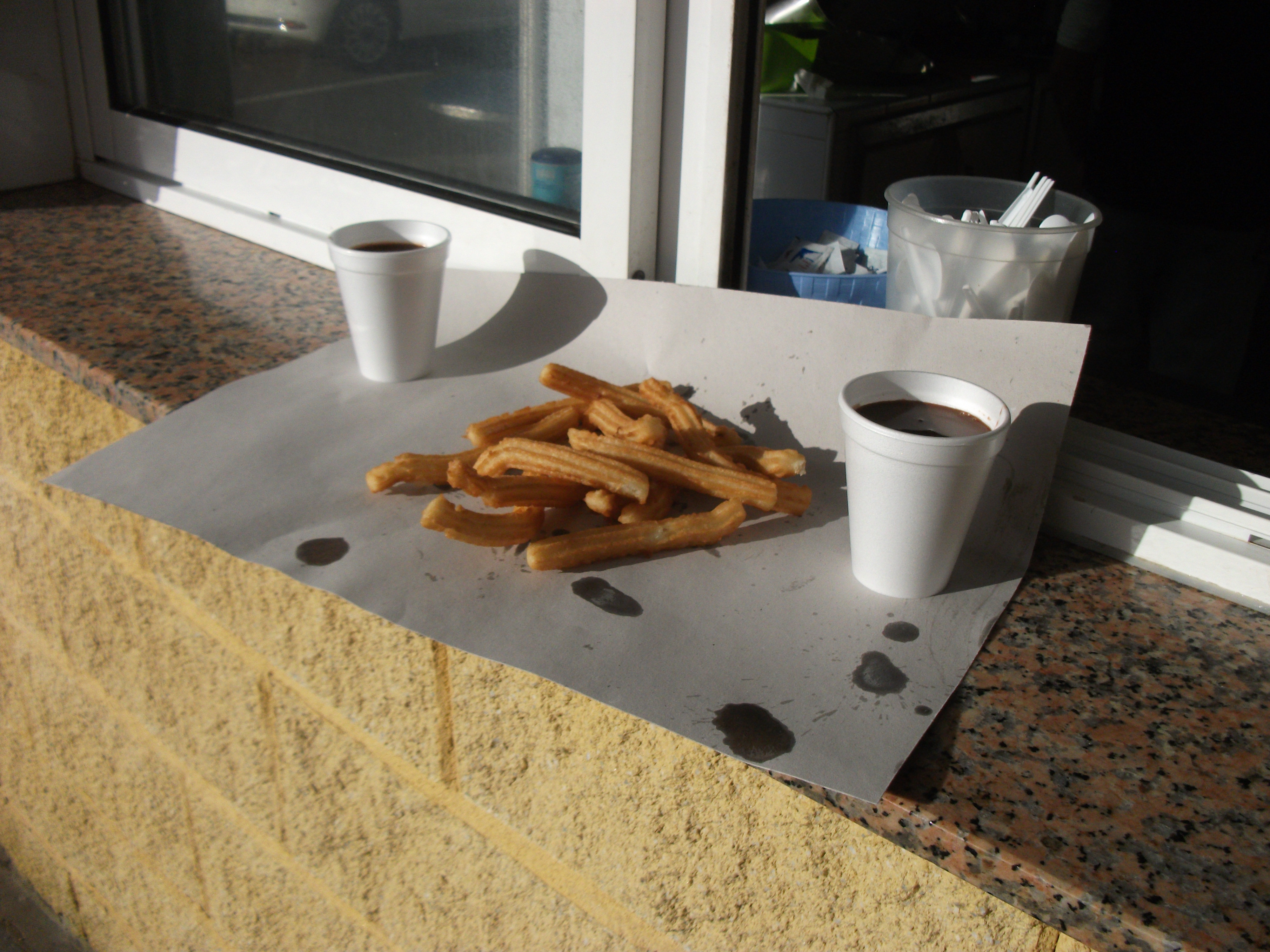 Wir beschließen, vor dem Frühstück einen Spaziergang auf der Promenade zu machen und irgendwo einen Kaffee zu trinken. Auf unserem Übernachtungsparkplatz gibt es auch ein Büdchen. Dort machen sie Churros. Das ist ein spanisches Fettgebäck.