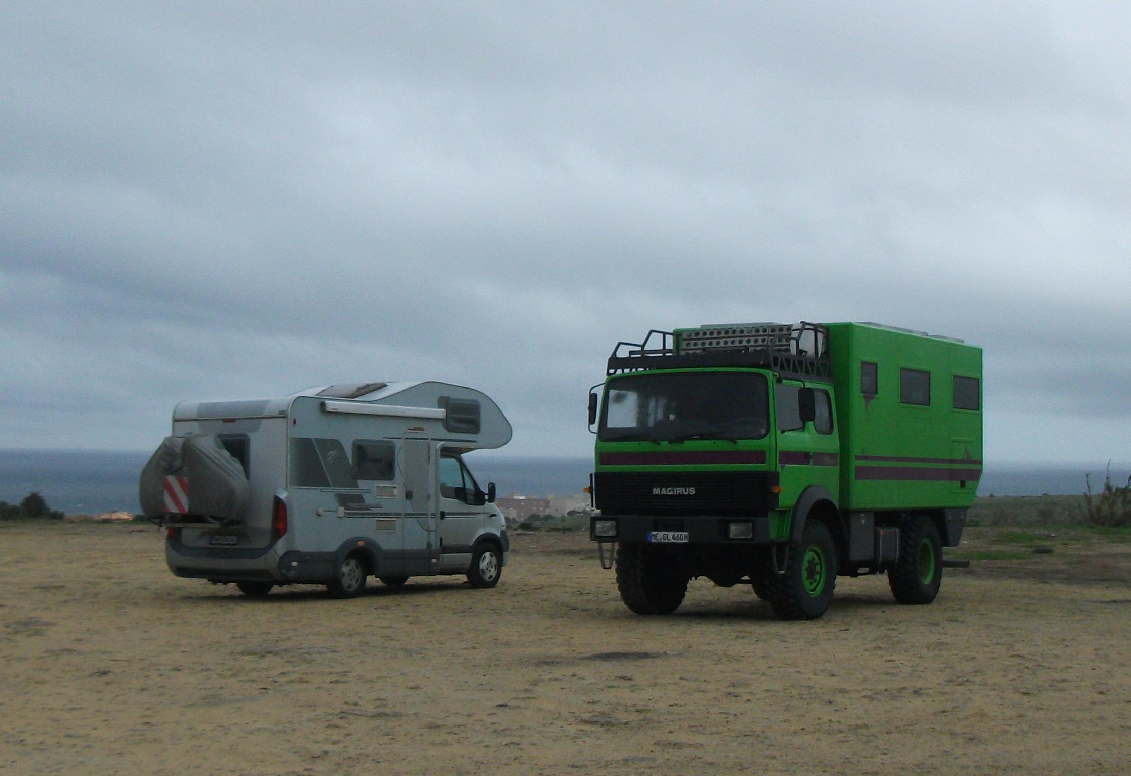 In Tarifa haben wir wieder Sicht und auf dem ersten freien Platz sehe ich ein großes grünes Fahrzeug leuchten, dass mir sehr bekannt vorkommt. Für mich sogar ist es richtig “berühmt”, denn es ist “Herman”, ein Allrad-Wohnmobil. Ein Paar lebt seit fünf Jahren mobil und sie schreiben einen ausführlichen blog, auch über ihre Reisen nach Marokko. Daraus hatte ich mir in den letzten Wochen viele Infos für unsere Reise geholt. Ich bin richtig aufgeregt, sie persönlich zu treffen, lustig!