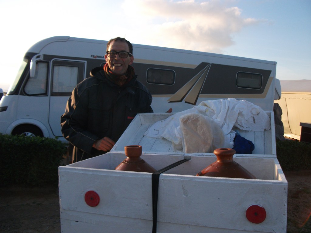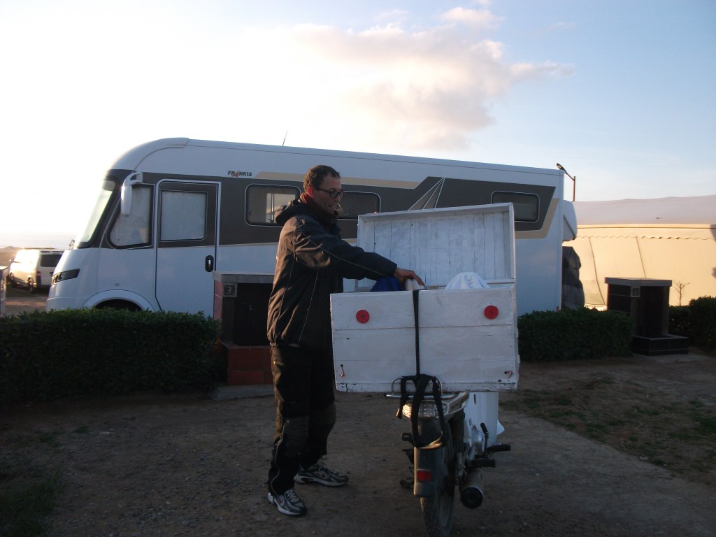 Den Begriff haben wir von Ali gelernt. Wir kennen ihn seit Sonntag, als wir in Oualidia, ein Fischerort ca.200km südlich von Casablanca, den Campingplatz nicht gefunden haben. Mit Ali voran auf dem Moped finden wir den Platz ganz leicht. Ali betreibt seit 12 Jahren einen Tajine-Service. Tajjine heißt sowohl das Gericht, als auch der Topf. Er bringt die fertig gekochten Mahlzeiten, die seine Frau zubereitet, zu den Wohnmobilen. Sehr praktisch. Wir bestellen für den nächsten Tag eine mit Fisch. Bei meiner Beschäftigung mit dem Thema „Backen im Wohnmobil“ bin ich drauf gestoßen, dass man auch in der Tajjine backen kann, von daher hatten wir in letzter Zeit schon Ausschau auf Märkten danach gehalten. So bringt Ali mir eine Neue vorbei („wenn Sie wollen, kann ich ihnen alles besorgen“)
