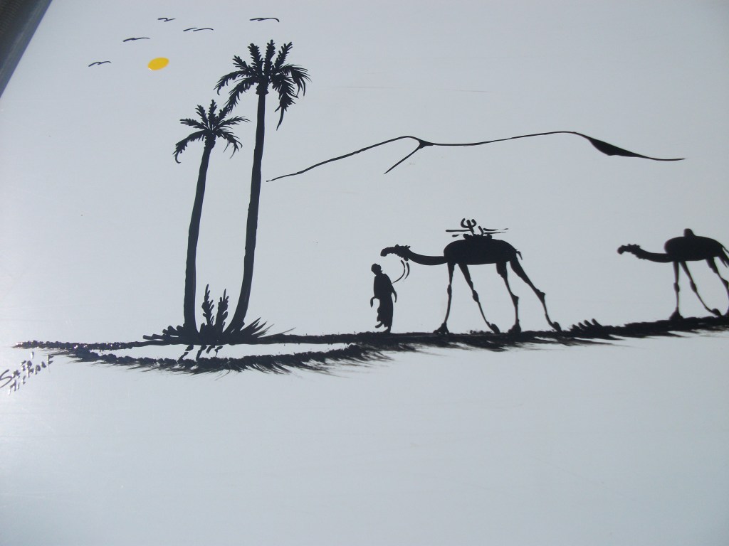 Ein anderer bemalt Wohnmobile, das hatten wir auch schon gesehen und haben uns für ein kleines Bild entschieden. Nur haben wir keine Leiter, der Maler auch nicht und so steht der Stuhl auf einer Tonne und Eckhard muss den Stuhl festhalten.
